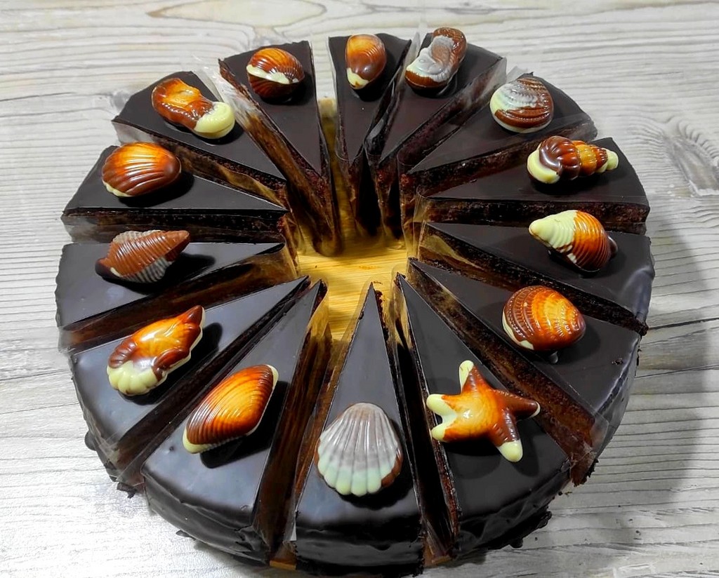 Čokoládový korpus, jemný krém s belgickou čokoládou. Shora politý tmavou čokoládou a zdobený belgickými pralinkami.