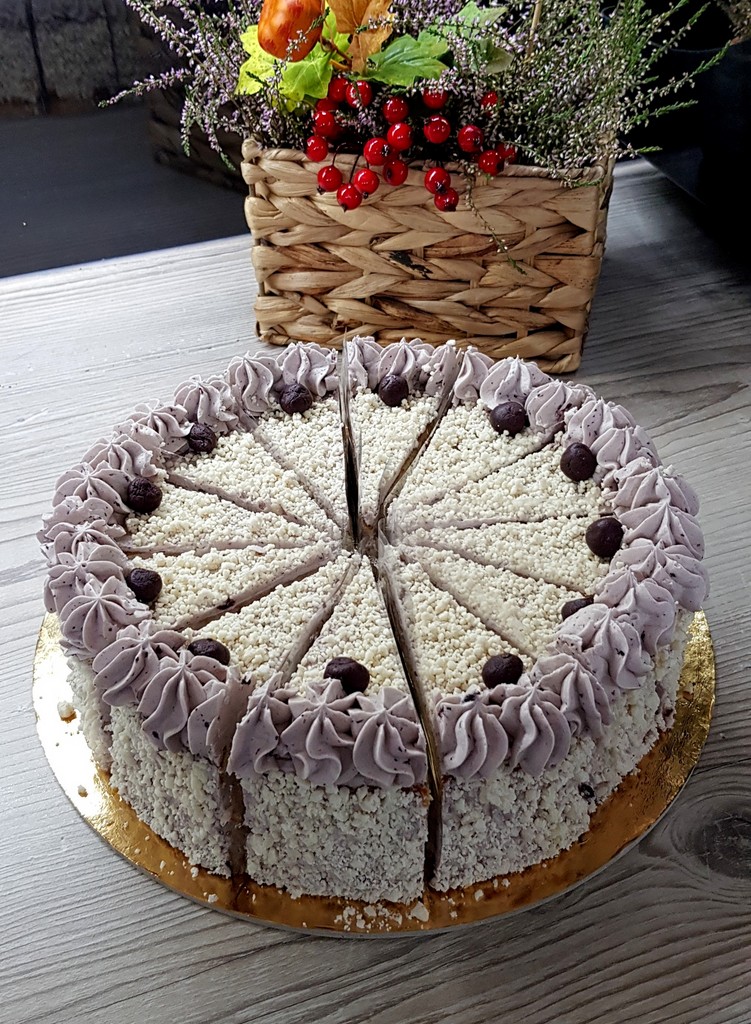 Vanilkový korpus proložený borůvkovým krémem a borůvkovým gelem. Dort je posypaný bílou čokoládou a ozdoben borůvkami.