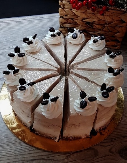 Jemný čokoládový a vanilkový korpus, kávový šlehačkový krém.