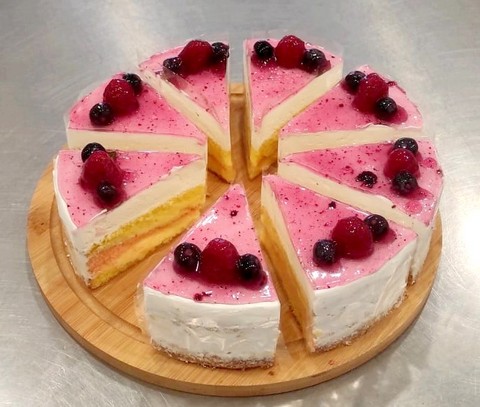 Vanilkový korpus, malinový krém, vrstva šlehačkys mascarpone, ozdoben lesním ovocem v gelu.