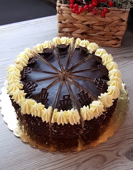 Jemná čokoládový korpus, vanilkový krém, čokoládové zdobení.