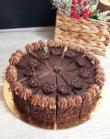Jemná čokoládový korpus, čokoládový krém, čokoládové zdobení.