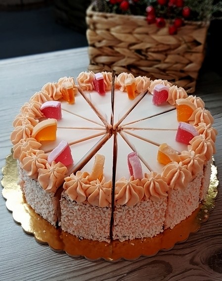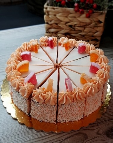 Jemný vanilkový korpus, pomerančový krém, zdobení bílou čokoládou.
