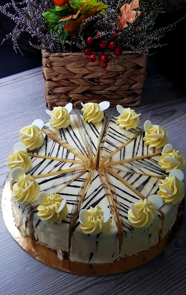 Jemný vanilkový korpus, krém vaječný likér, politý a zdobený čokoládou.