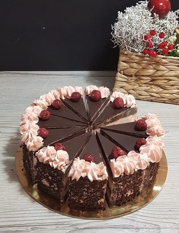 Jemný čokoládový korpus, višňový krém, zdobený čokoládou a višněmi