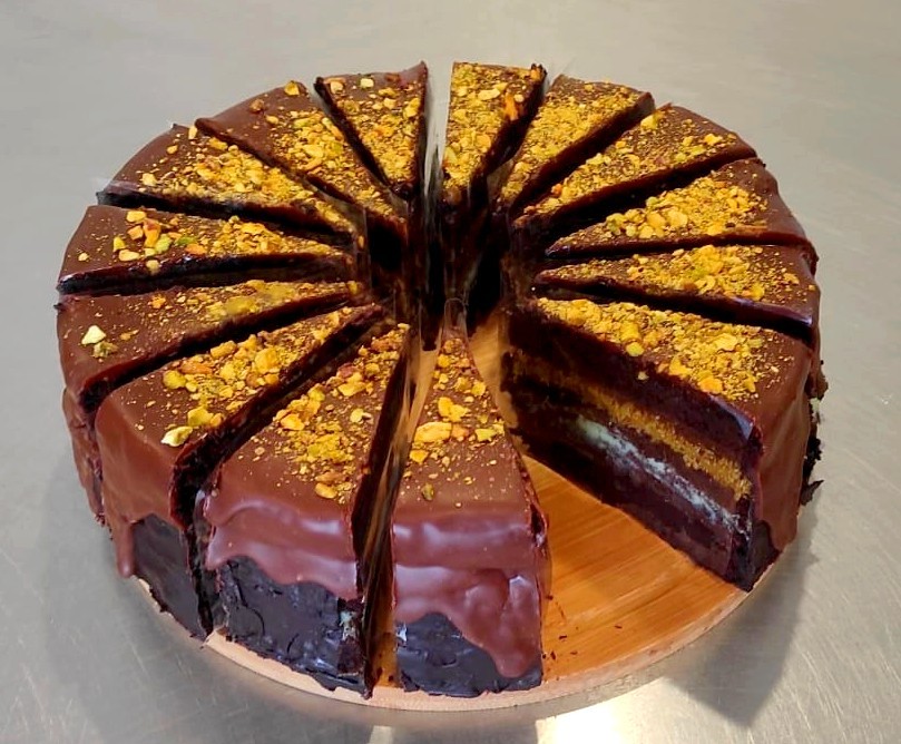 Čokoládový korpus proložený vrstvou čokoládové ganache, pistáciového krému, pistáciové pasty a kadayifu. Shora politý tmavou čokoládou a mléčnou čokoládou, zdobený posypanými pistáciemi.