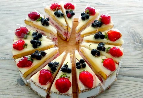 Vanilkový korpus, krém ze šlehačky a mascarpone s vrstvou čerstvého ovoce. Shora politý bílou čokoládou a zdobený čerstvým ovocem.