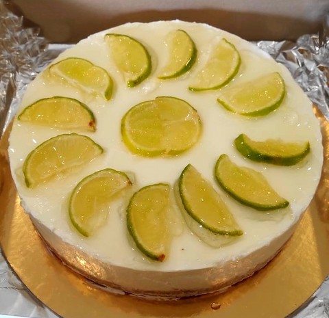 Sušenkový korpus - Lotus, limetková vrststva sýrového krému. Shora zdobený čerstvou limetou v gelu.