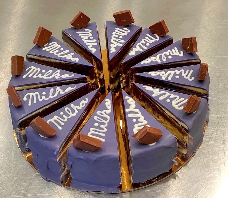 Čokoládový korpus, pudinkový krém s kousky čokolády milka. Politý je fialovou čokoládou a zdobený nápisem Milka a kousky čokolády.