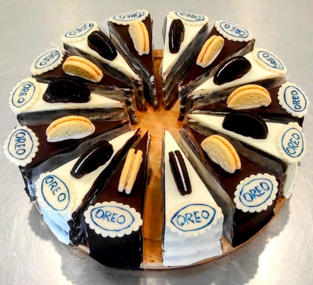 Korpus z černého kakaa, krém z bílé ganache, politý z poloviny bílou čokoládou a z poloviny tmavou čokoládou, zdobený sušenky oreo.