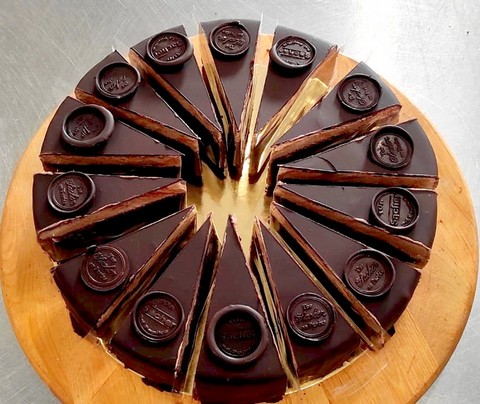 Čokoládový korpus, pařížský krém, meruňková marmeláda. Shora politý mléčnou čokoládou a zdobený pečetí.
