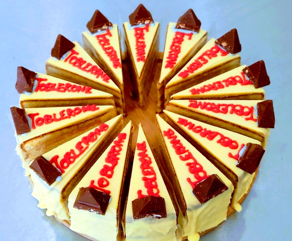 Vanilkový korpus, čokoládovo-oříšková ganache s kousky tureckého medu. Shora politý bílou čokoládou a zdobený kousky čokolády toblerone.